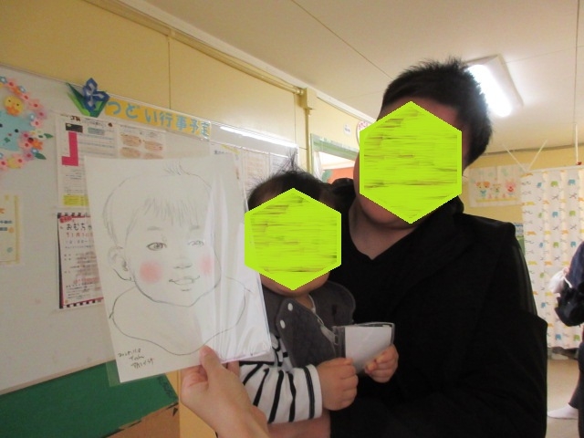 本日はパパ・ママ、じいじ・ばあばと、沢山の人に来館してもらい、出来上がった可愛いこどもの似顔絵を楽しんでもらいました。職員にも、みなさん嬉しそうに出来上がった似顔絵を見せてくれました。参加して頂いた皆様ありがとうございました。