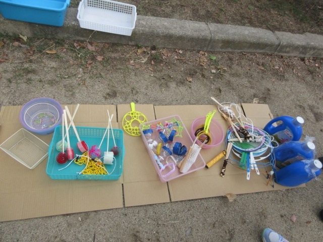 職員の手作りしゃぼん玉道具で普段とは違うしゃぼん玉体験ができて