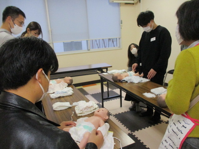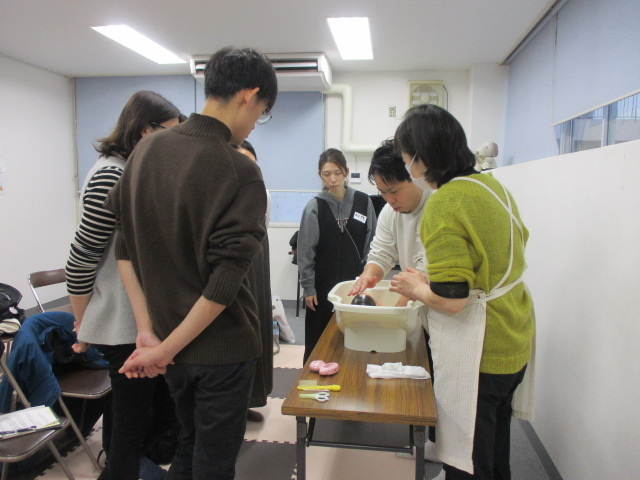 講師による沐浴デモンストレーション、体験(沐浴・着替え・抱っこ)の講座です。12月21日に実施しました。参加した方からは「夫に体験してもらって実感が少しでもわいてくれたと思うので、とても貴重な時間だった」「妻の日頃のたいへんさを実感できた」等感想がありました。